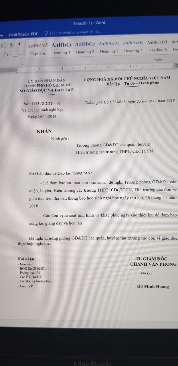 V/v Nghỉ học thứ Hai, ngày 26/11/2018